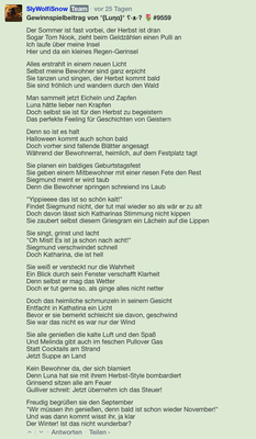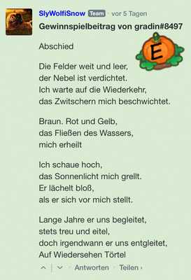 Der Monat der Gedichte und Geschichten ist vorbei. Somit sind die Einsednungen für das vergangene Gewinnspiel beendet. Wir möchten uns bei allen Teilnehmern bedanken: